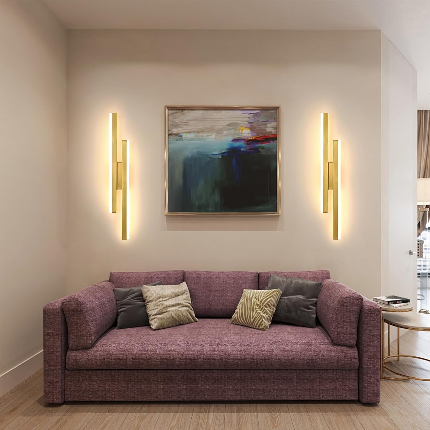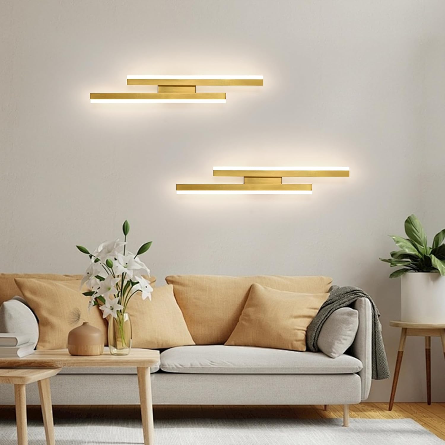 Features a minimalist design with two offset light columns creating an asymmetrical aesthetic. The gold finish provides a warm and luxurious appearance.