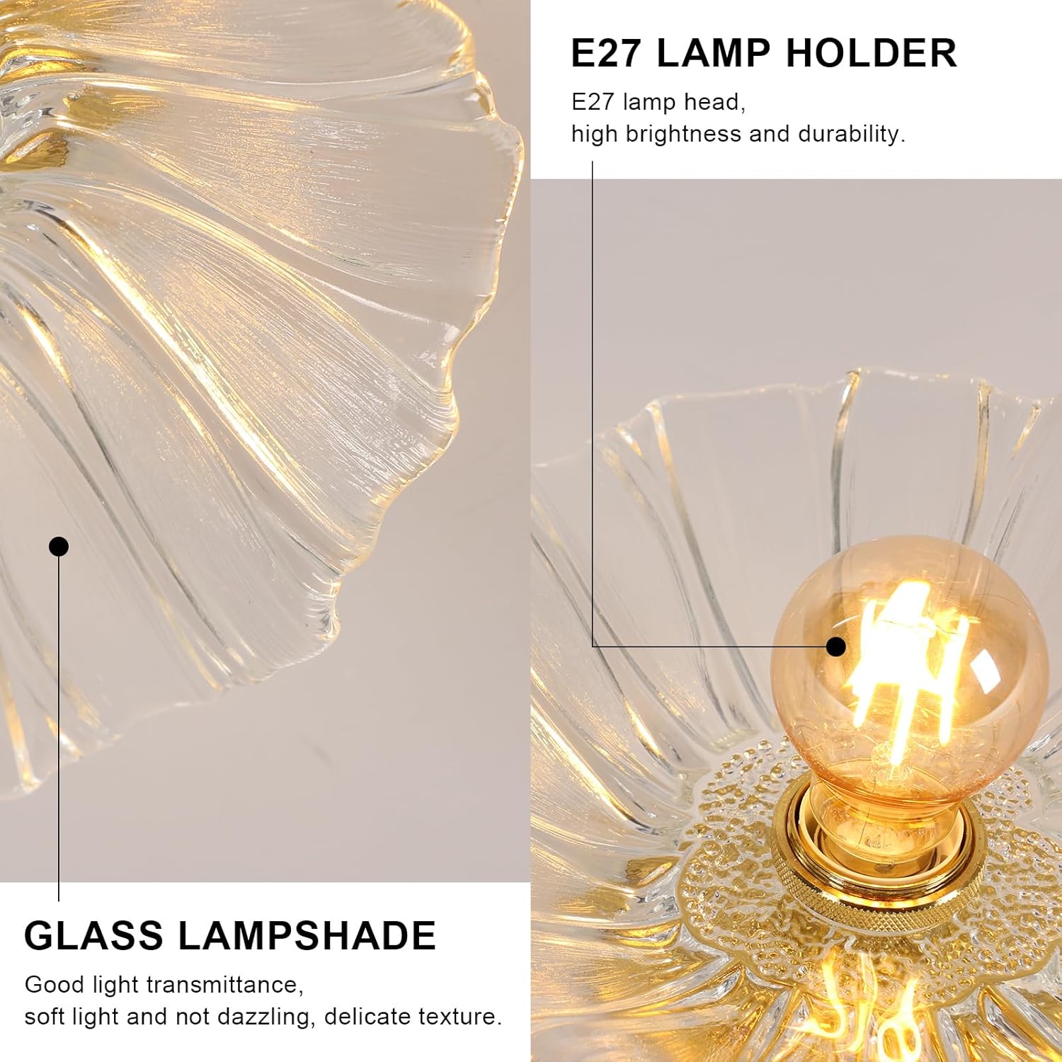 La pantalla está fabricada con vidrio de alta calidad que ofrece buena transmisión de luz y resistencia al calor. La base metálica dorada ha sido cuidadosamente tratada para mejorar su resistencia a la oxidación y la corrosión, garantizando una combinación equilibrada entre estética y durabilidad. La combinación de vidrio y metal proporciona a esta lámpara de techo vintage un aspecto sofisticado que se adapta fácilmente a interiores modernos, clásicos o de estilo elegante.